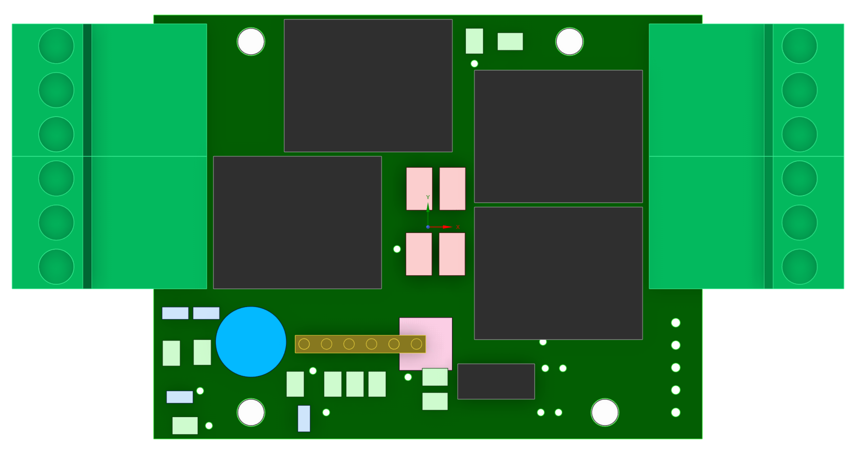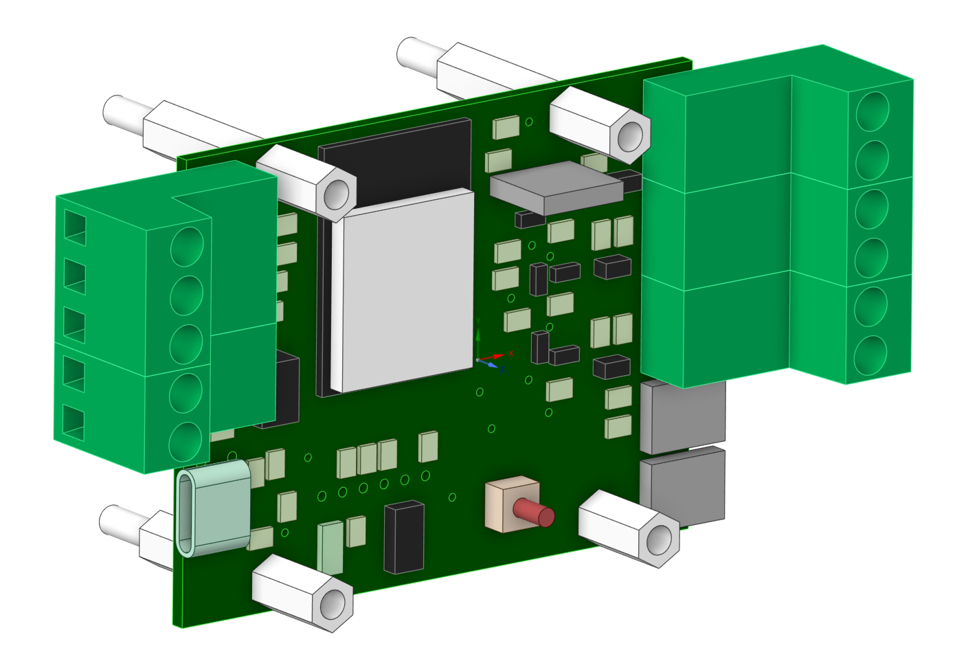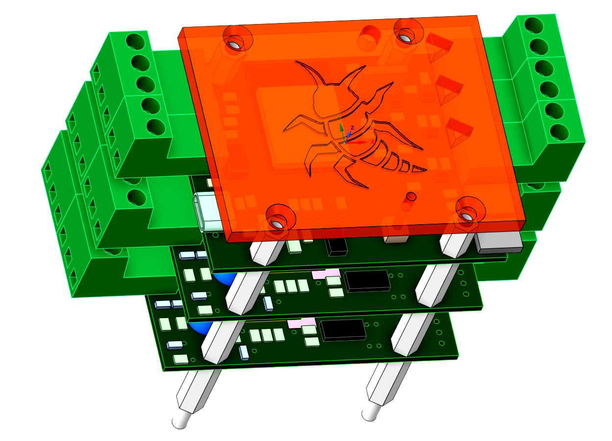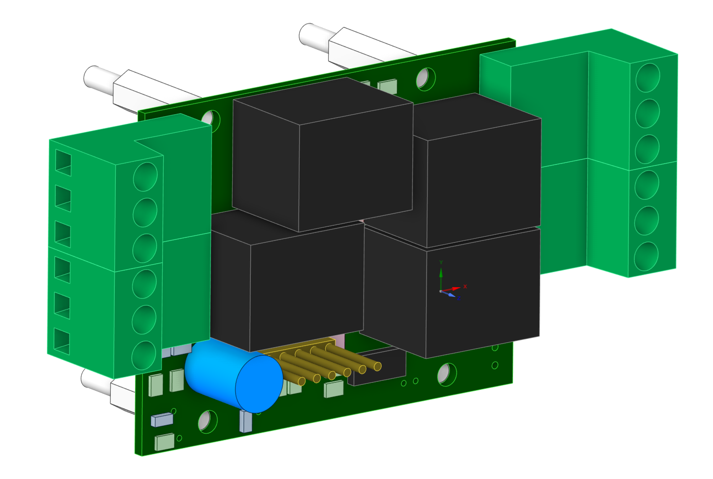 The RLY (relay) module is designed for safe, galvanically isolated power switching of electrical devices. It uses LEG-5 relays, rated for up to 15 A and 230 V. The module provides four independent channels. The MCU that communicates with the BIR module over the bus is powered from 3.3 V, while the relay coils are driven from 5 V.