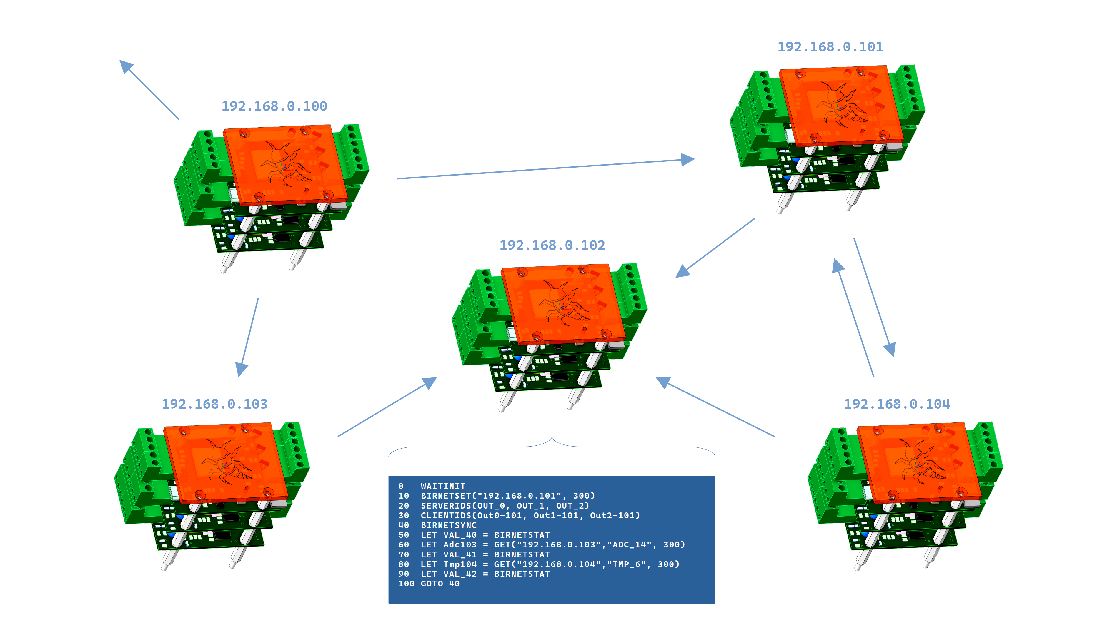 BIRNET allows multiple BIR modules to communicate with each other directly over the local network, without using the cloud backend. Typical use cases include sharing sensor values between rooms, synchronizing outputs across devices, or offloading part of the logic to a dedicated “server” BIR.