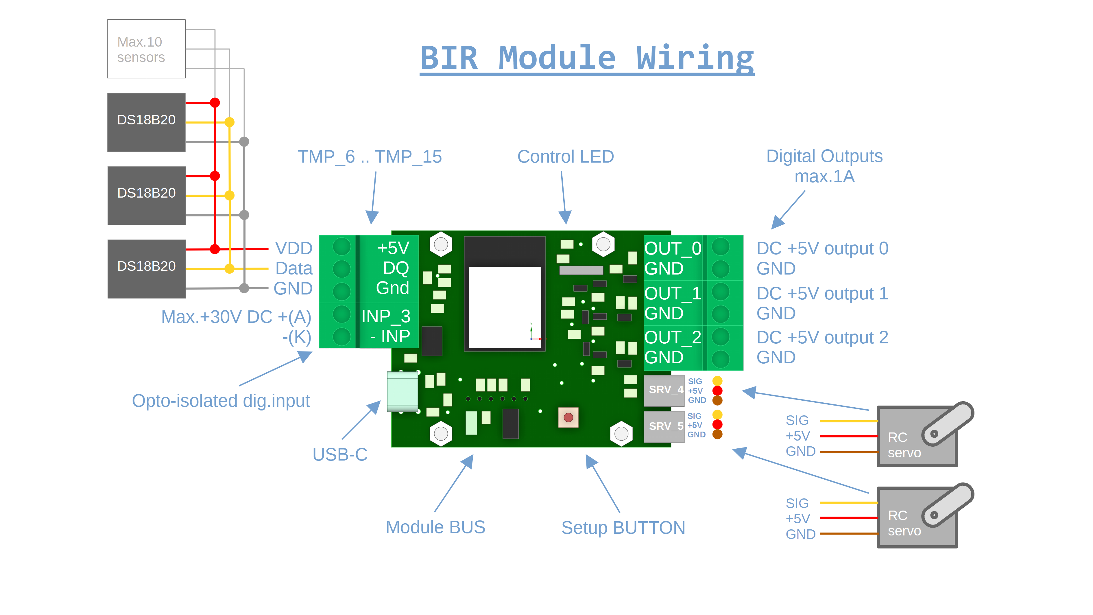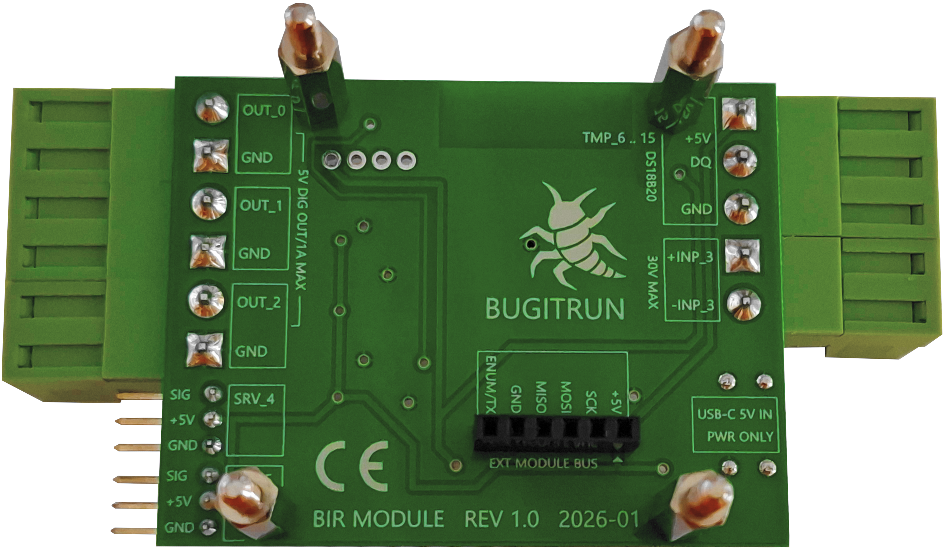 The built-in BIR hardware (OUT / INP / SRV / TMP / VAL) is primarily meant for learning, prototyping and smaller projects. Because these channels are connected directly to ESP32 pins, the internal response is very fast and latency is minimal.