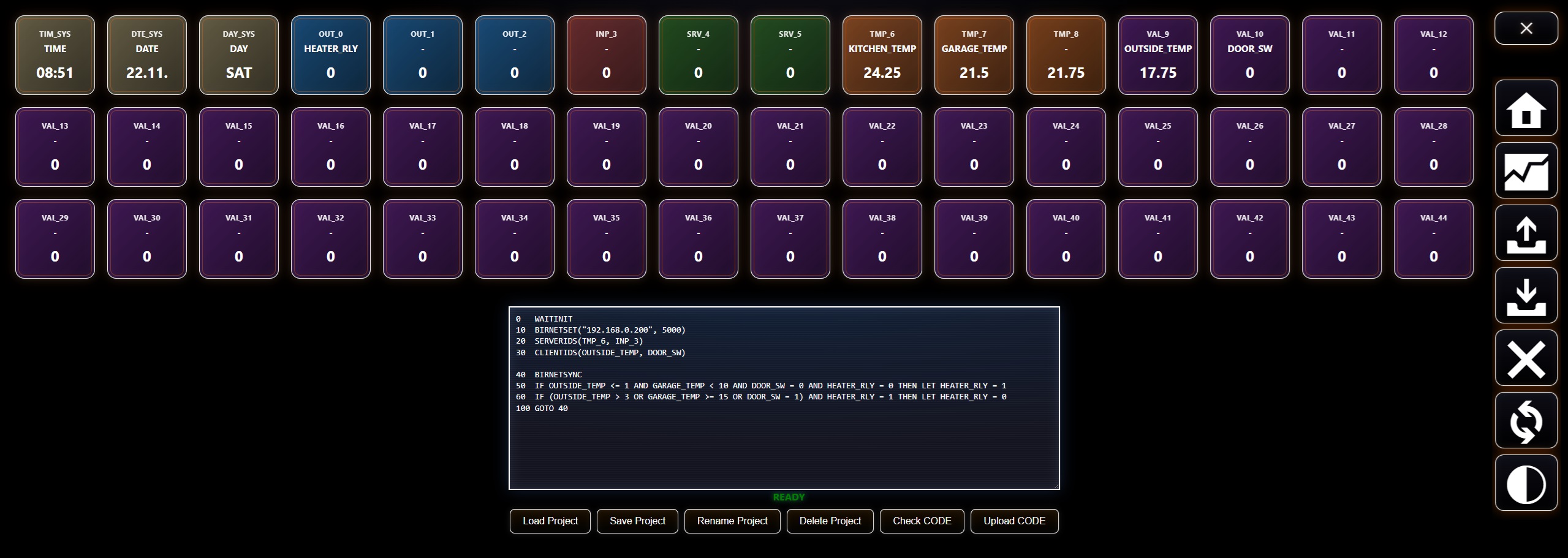 (up to 10 sensors in total).TMP_x ID.TMP_x objects are created.TIM_SYS – current time of day (same numeric representation as TIME).DTE_SYS – current date (same numeric representation as DATE).DAY_SYS – current day of week (same numeric representation as DAY).These objects are updated automatically by the BIR firmware and are read-only from BASIC.