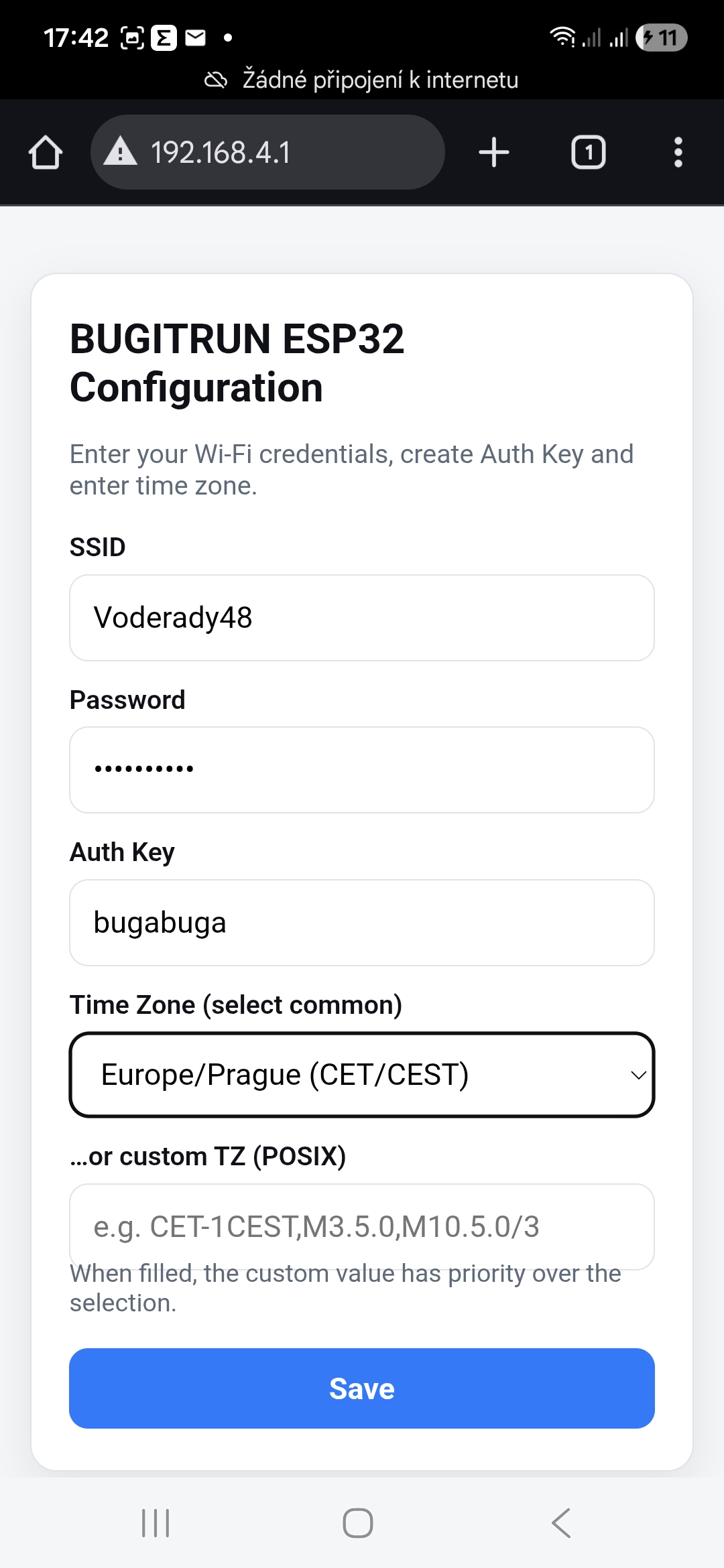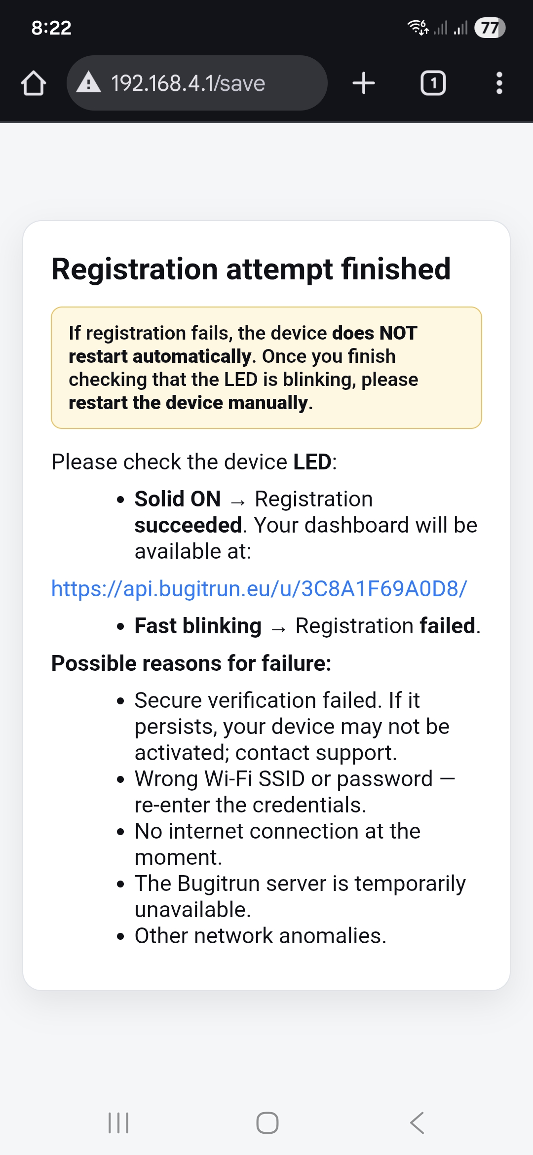 Initialization can be repeated at any time, for example when changing Wi-Fi parameters or the Auth Key, or when handing the module over to a new user. To restart initialization, press and hold the setup button on the BIR module for approximately 10 seconds, until the status LED turns on. The device will erase its stored configuration, reboot, create the BUGITRUN_SETUP Wi-Fi network again and expose the initialization page at http://192.168.4.1, so the initial initialization procedure can be performed once more.